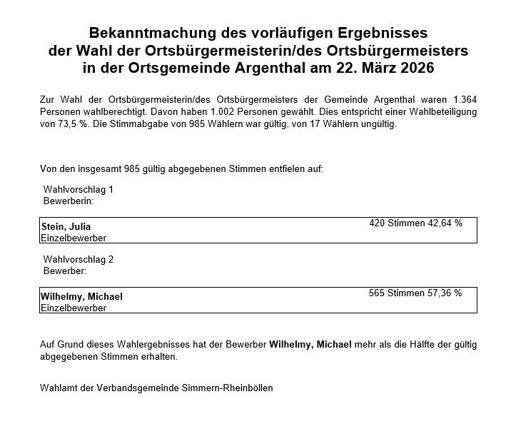 Neuwahl Ortsbürgermeister/in der Ortsgemeinde Argenthal